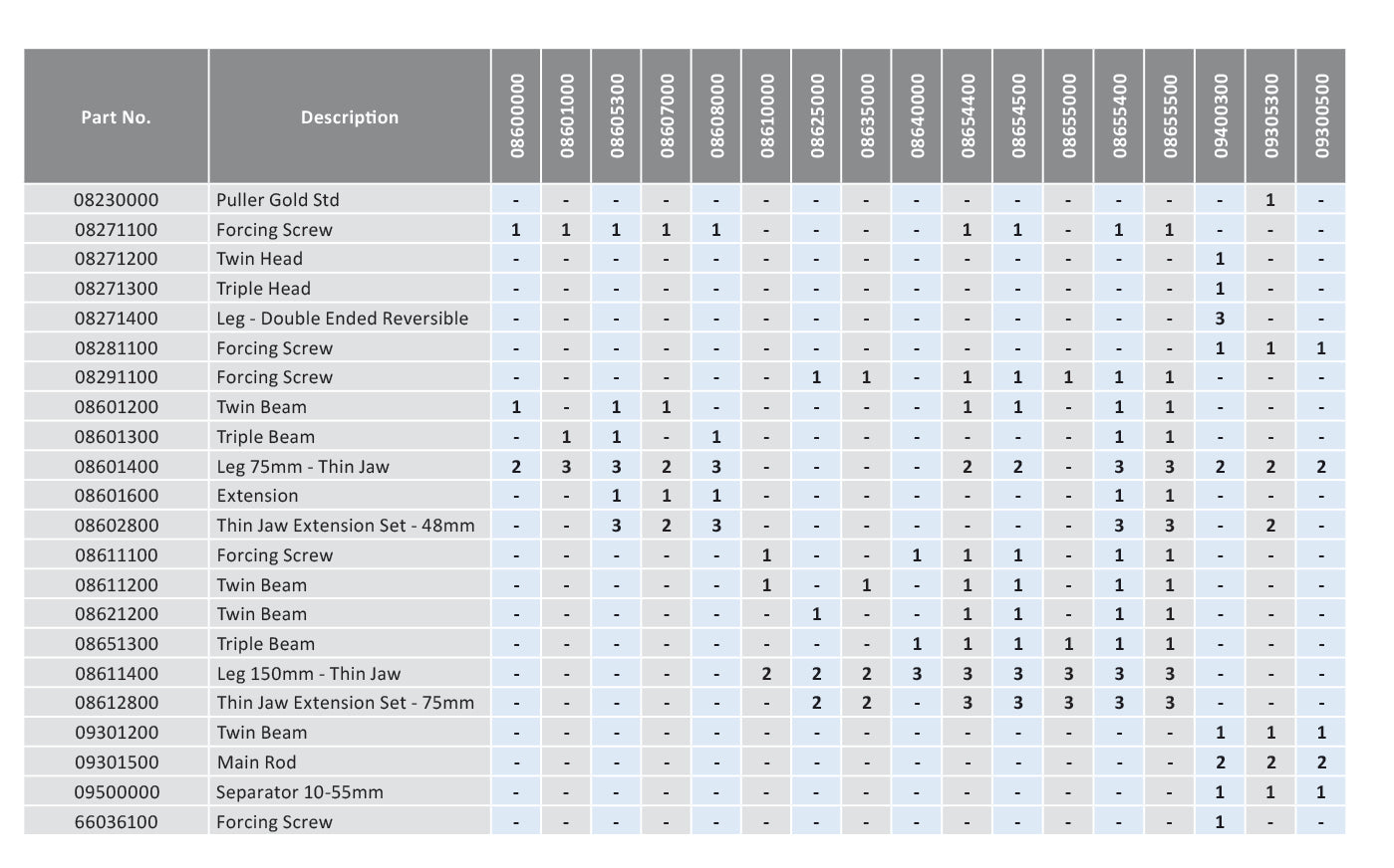 See puller components illustrations and kit content tables for more details on spares